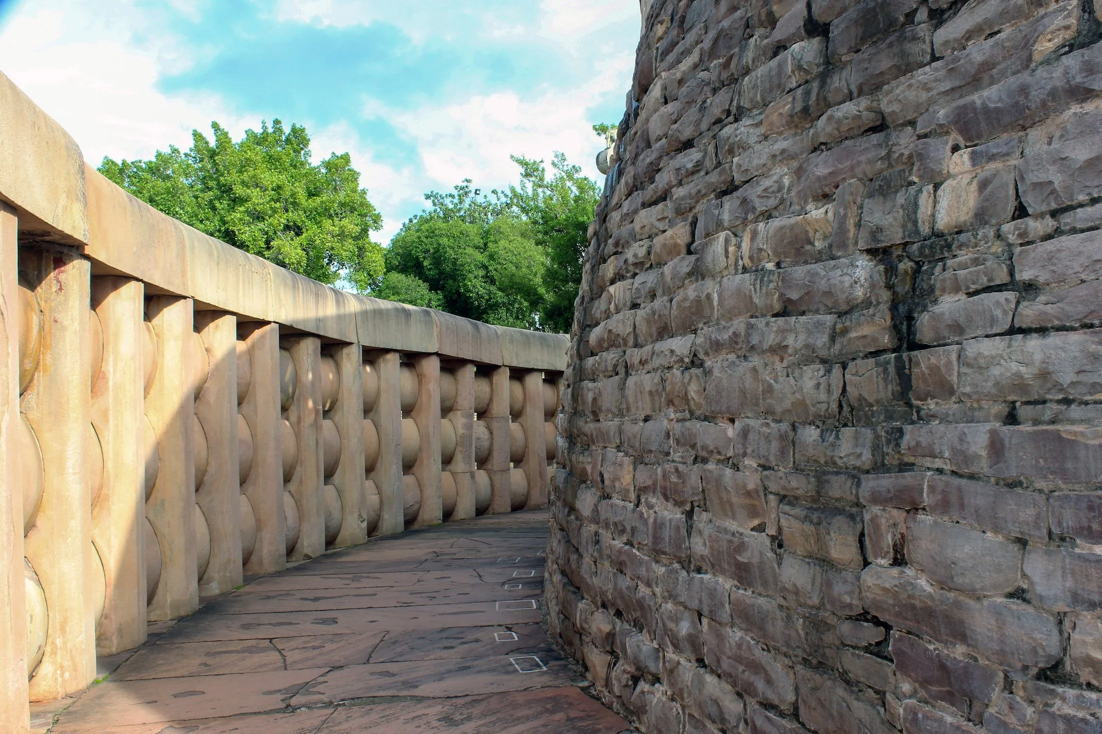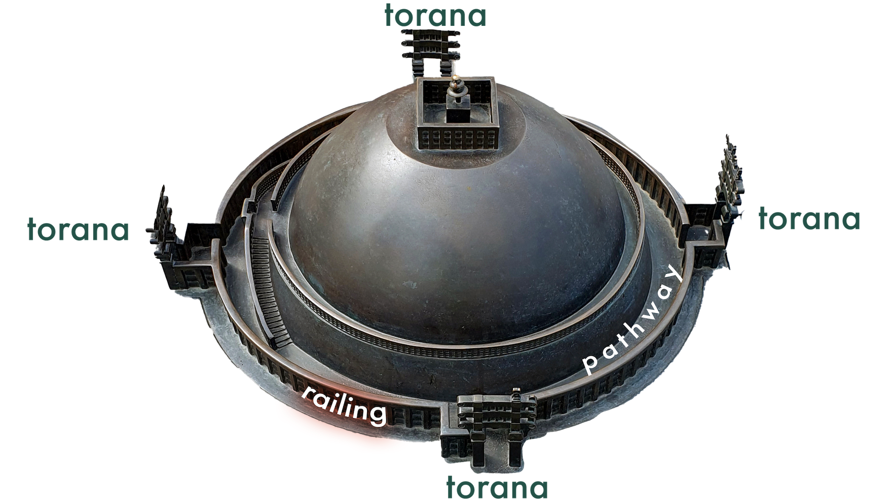 The Great Stupa is surrounded by a circular stone railing with four torana gateways. The gateways lead to a path for pradakshina, or ritual circumambulation, around the solid stone hemisphere to prepare the mind for meditation. Each torana is composed of two posts and three architraves, and they are richly decorated with relief carvings that depict narratives from the life of the Historical Buddha.